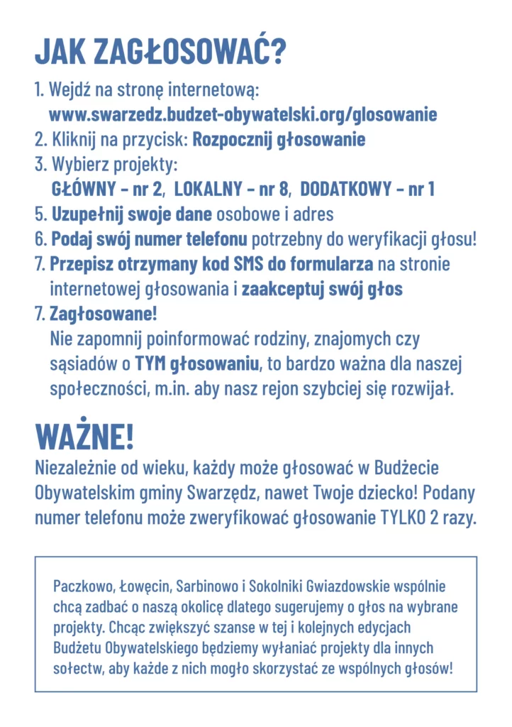Mieszkańcy Paczkowa, Łowęcina, Sarbinowa i Sokolnik Gwiazdowskich już niedługo będą mogli mogą głosować w Budżecie Obywatelskim gminy Swarzędz na projekty dotyczące naszego rejonu !!!