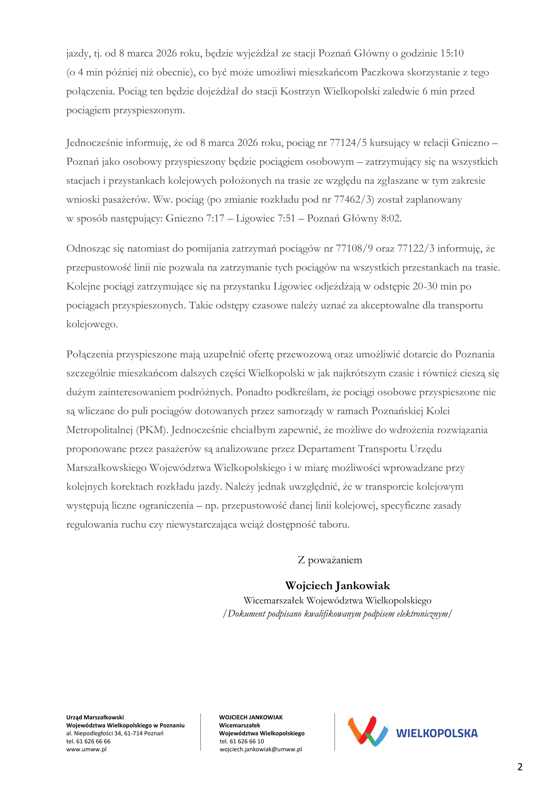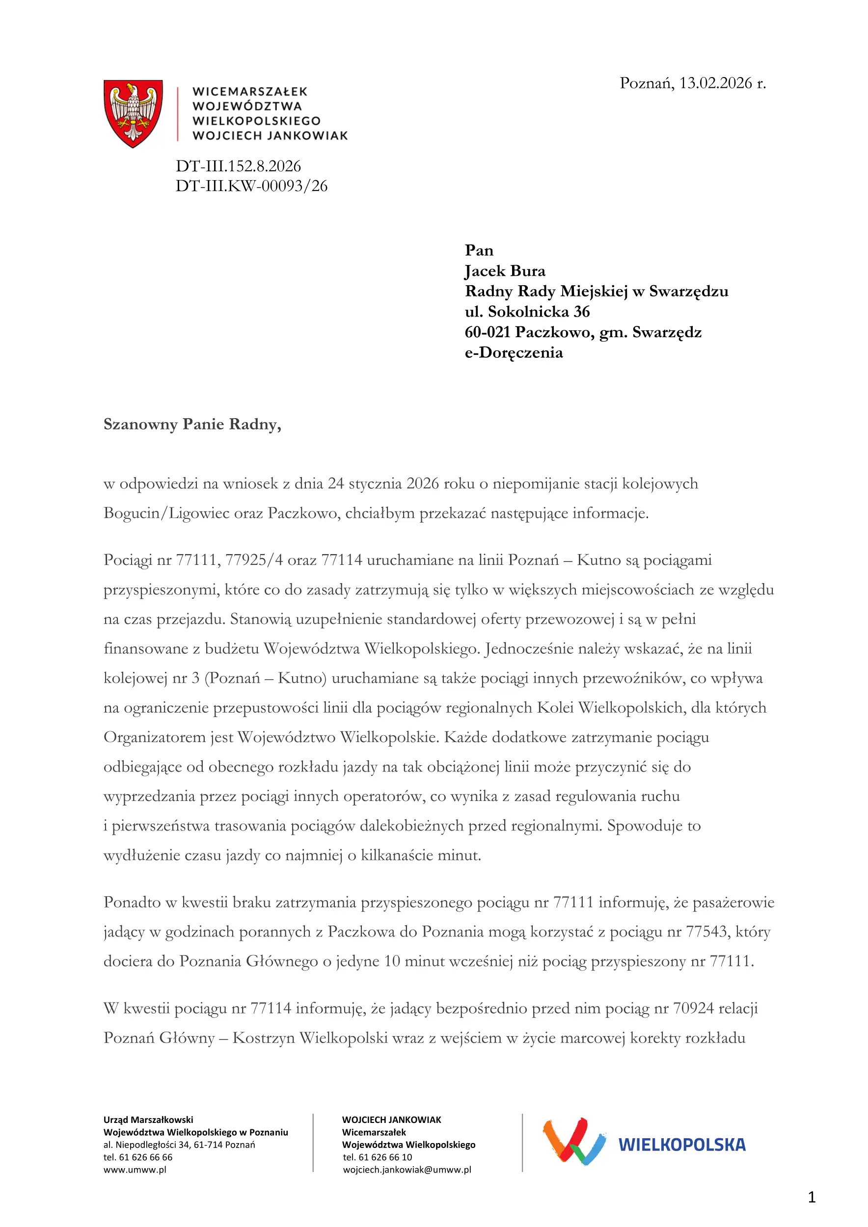 13 lutego otrzymałem odpowiedź (na dole artykułu) od Wojciecha Jankowiaka Wicemarszałka Województwa Wielkopolskiego na pismo z dnia 24 stycznia 2026 w sprawie przywrócenia zatrzymywania się pociągów Kolei Wielkopolskich tzw. przyspieszonych na stacji kolejowej w Paczkowie.