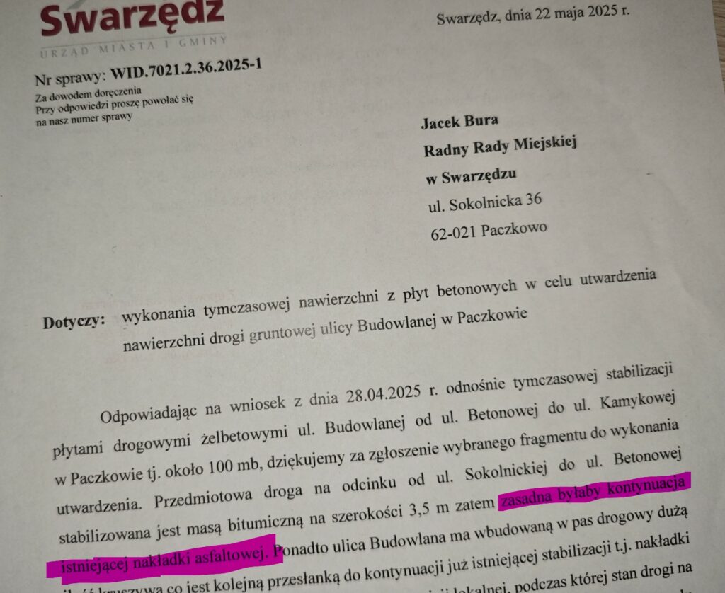 Podczas XXIII Sesji Rady Miejskiej I Zastępca Burmistrza Grzegorz Taterka przekazał informacje o realizacji nakładek asfaltowych w Paczkowie na ul. Budowlanej i w rejonie skrzyżowania ul. Wiosennej i Letniej