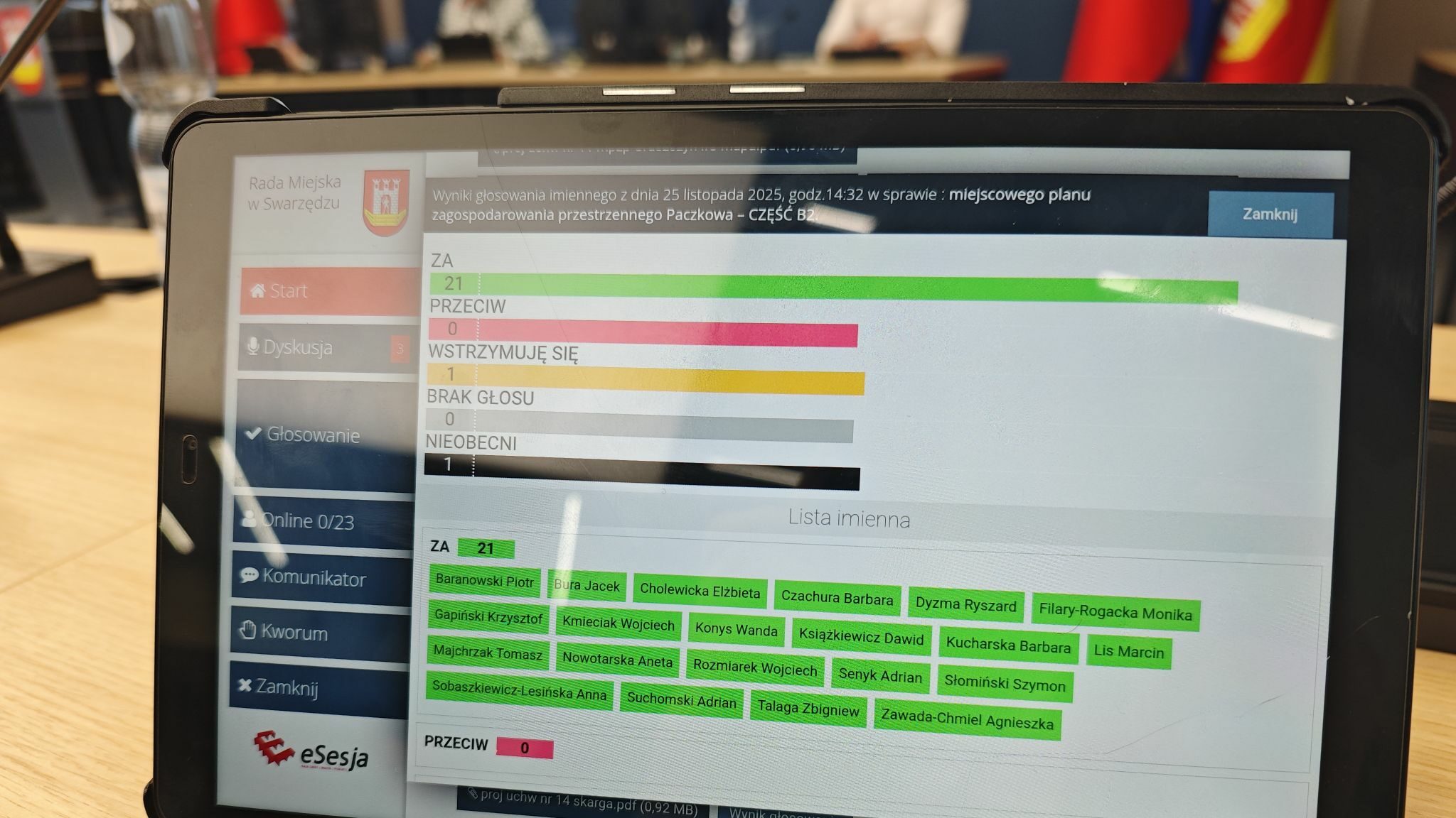 Podczas XXIV Sesji Rady Miejskiej Radni uchwalili Projekt Miejscowego Planu Zagospodarowania Przestrzennego Paczkowa cz. 2, który był szeroko konsultowany z mieszkańcami w 2022-2023 roku – więcej tutaj: Sukces – nie będzie hal w centrum Paczkowa, 2, 3