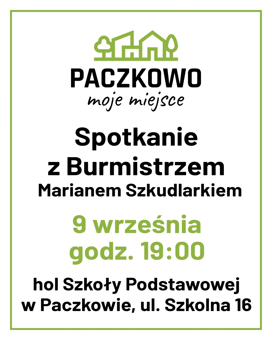 Serdecznie zapraszam mieszkańców Paczkowa na spotkanie z Burmistrzem Miasta i Gminy Swarzędz Marianem Szkudlarkiem, które odbędzie się 9 września o godzinie 19:00 w holu Szkoły Podstawowej w Paczkowie, ul. Szkolna 16.