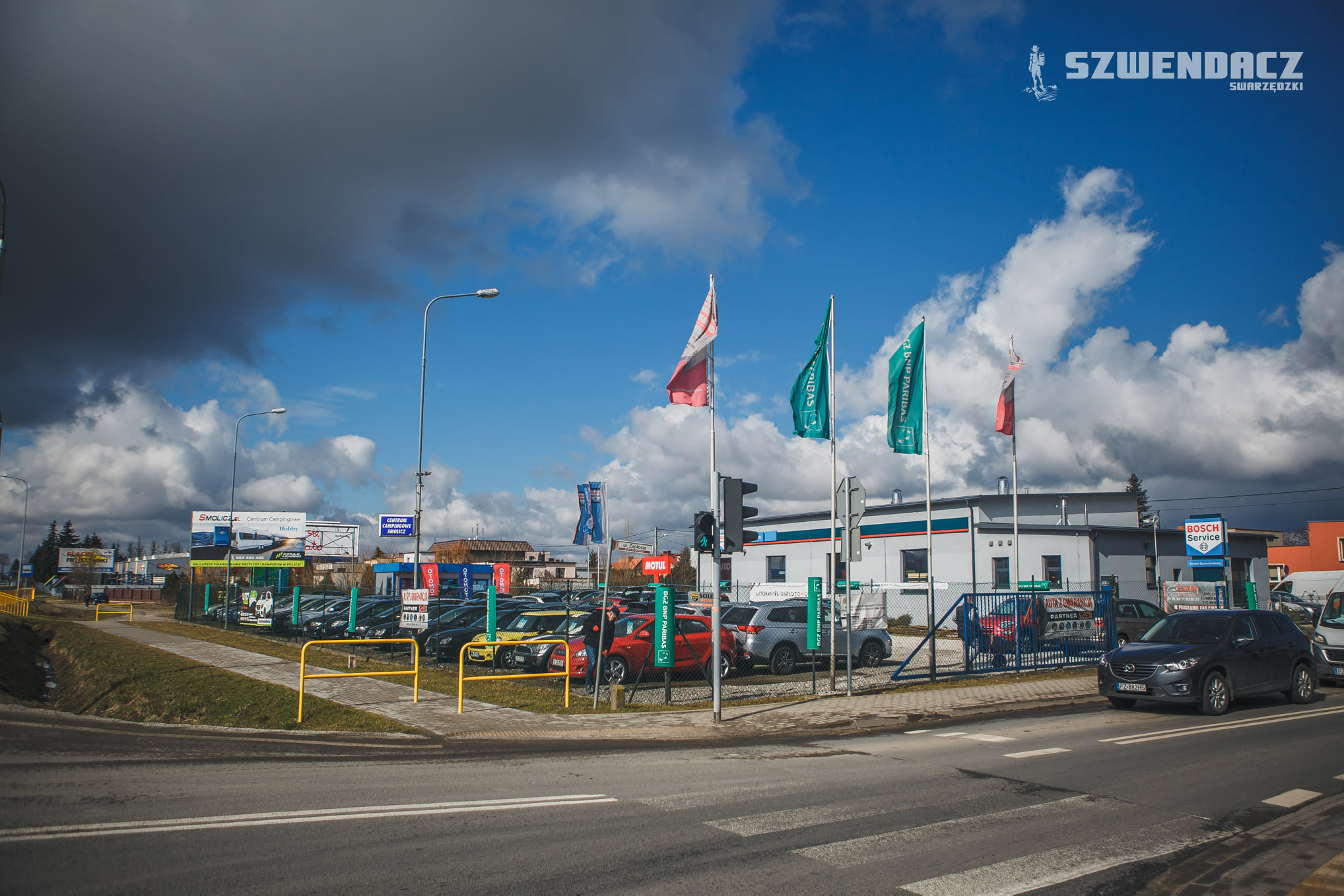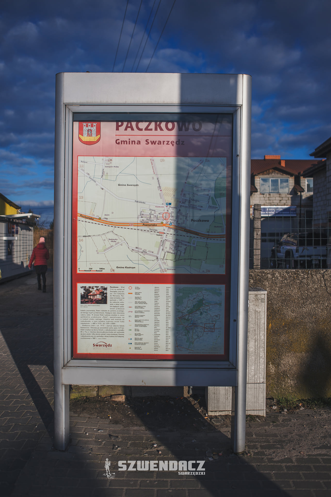 Paczkowo to wieś leżąca 5 km na wschód od Swarzędza. Nazwa wsi pochodzi od pochodnej imienia Pakosław czyli Paczek.Nazwa Paczkowo została wspomniana po raz pierwszy w dokumencie z roku 1329. Ze Swarzędza dojedziemy tu krajówką nr 92.Ja jednak dotarłem tu od strony Sarbinowa…Sarbinowska 3.Znana w Paczkowie już z okresu Polski Ludowej, Rolnicza Spółdzielnia Produkcyjna “Pokój” zajmująca się hodowlą kurek niosek tylko na jajka, widoczna od Sarbinowskiej.Sarbinowska 1.Przystanek przy Sarbinowskiej.Widok na Sarbinowską w stronę Sarbinowa.Przy skrzyżowaniu Sarbinowskiej, Zapłocie, Kościelonki i Dworskiej, powstał market Dino.Przy skrzyżowaniu spotykam grupę przedszkolaków, skręcającą w Dworską.Widok na ulicę Dworską ze skrzyżowania.Po lewej trafiam na pierwszy, zabytkowy obiekt Paczkowa, Dwór eklektyczny z roku 1910. Od roku 1958 był to główny budynek szkolny w Paczkowie.Po prawej mijam nowo powstałe Studio Groomerskie “Psia Psiółka”.Skręcam w prawo, w Szkolną.To przy tej ulicy znajduje się budynek starej szkoły powszechnej, powstałej w roku 1904, przeznaczonej początkowo dla Niemców. Obecnie znajduje się tu Świetlica Wiejska i Filia Biblioteki Publicznej w Swarzędzu.Tak obecnie prezentuje się nowa szkoła podstawowa w Paczkowie.Posiada nową salę gimnastyczną, plac zabaw…Oraz boisko ORLIK wraz z szatniami. To boisko ,na którym Szwendacz spotyka się na piłce z kolegami.Przy szkolnej napotykam też zabytkowe domy. To Szkolna 13.A także Szkolna 15.Figurka przy posesji Szkolna 15.Na Szkolnej spotykam pana Piotra, tutejszego listonosza. Znają Go tu wszyscy. Mimo ogromu pracy, zamienia słowo ze Szwendaczem.Tuż obok znajduje się Oddział Poczty PolskiejPrzydrożny krzyż naprzeciw budynku Poczty.Od Szkolnej odchodzi ulica Braterska. Dojdę nią do ulicy Sokolnickiej.Widok na Sokolnicką od strony południowej.Hobby Akcesoria. Wjedziemy tu właśnie z Sokolnickiej.Widok na Sokolnicką od strony północnej.Widok na wjazd w Sokolnicką od strony ulicy Dworskiej.To tu znajduje się Przedszkole i Żłobek “Jarzębinka Paczkowo”.Ulicą Sokolnicką dojedziemy do pobliskich Sokolnik Gwiazdowskich. Warto jednak wspomnieć tu o firmach braci Potockich.Firma Meble Potocki istnieje w Paczkowie już ponad 30 lat. Pan Mieczysław wraz ze swoim synem i pracownikami dumnie pozują Szwendaczowi.Sokolnicka 60.Tu mieszka Pan Feliks Potocki.Rdzenny paczkowianin zajmuje się ogrodnictwem a jego rośliny znane są w całej gminie.Wracam na Dworską a później zjeżdżam w ulicę Zapłocie.Przy ulicy Zapłocie mijam firmę budowlaną DAGABUD pana Gronowskiego…I odwiedzam sklep ze świeżym pieczywem firmy PIEKPOL. Sprzedaje tu przemiła Pani Agnieszka, która pozdrawia wszystkich paczkowian.Popularnym sklepem są w Paczkowie również należące do sieci ABC, delikatesy o “zalotnej” nazwie SETKA.Ekipa SETKI. Szefowa, Pani Joanna wraz ze swoimi pracownikami: Iryną, Joanną i Mateuszem.Zapłocie 4a to Auto Serwis Jas-Car zajmujący się mechaniką pojazdową.Widok na odchodzącą od Zapłocia ulicę Wiosenną.Przy Wiosennej 1 skorzystamy profesjonalnych usług firmy Bosch Car Service.A przy ulicy Zapłocie 1 zakupimy auta w Auto Handel Dafi.Widok na wjazd w ulicę Zapłocie od strony południowej.Przez Paczkowo przechodzi krajowa droga nr 92. To ona dzieli wieś na część północną i południową.To oto skrzyżowanie jest głównym łącznikiem obu części Paczkowa.Ze skrzyżowania ujrzymy budek wspomnianej przeze mnie wcześniej Poczty Polskiej.A także ogromną planszę reklamową pod którą zlokalizowany jest tutejszy bar-pizzeria, RAJ SMAKU.Nowi właściciele “RAJU” ciężko pracują by zyskać sobie grono klientów z całej okolicy.Świetny pomysł na reklamę znalazł przy skrzyżowaniu Producent Mebli Tapicerowanych firma RAMARO. Ich pokazowy, oszklony kontener, widoczny jest świetnie z drogi krajowej.Postanowiłem, do nich zajrzeć. W tym celu udałem się do południowej części Paczkowa.Przywitał mnie tu uprzejmy, młody człowiek. To pan Piotr, który chętnie opowiedział mi o firmie, w której pracuje.Główną ulicą w tej części wsi jest ulica Średzka. Prowadzi ona od skrzyżowania z drogą nr 92 aż do ulicy Poznańskiej, którą dojedziemy do pobliskich Siekierek Wielkich.Wśród mieszkańców jednym z bardziej znanych sklepów jest ten oto “spożywczak” ANULA.Tuż obok, przy Średzkiej 19 mieszka tutejsza pani sołtys. Postanawiam i Ją odwiedzić.Pani Małgorzata Glabas-Gruszka to jedna z tych sołtysów, którzy w swojej wsi cieszą się ogromnym szacunkiem i sympatią. Pani sołtys z serdecznością zaprosiła mnie do swojego domu by w miłej atmosferze porozmawiać o Paczkowie.Po owocnej wizycie, ruszam dalej. Widać, że w Paczkowie zachodzą duże zmiany. Wprowadza się tu wielu nowych mieszkańców, co wymaga remontów zasłużonej już infrastruktury. Swarzędzka firma KRUG buduje przy Średzkiej właśnie nowy chodnik.Zaglądam w ulicę Ogrodową.Ona jest już po remoncie. Zyskała szeroki chodnik i wyłożona jest kostką brukową.Wiele nowopowstałych, odchodzących, od Średzkiej ulic, jest jeszcze jednak nieutwardzonych, jak na przykład widoczna na zdjęciu ulica Szparagowa.Przy Szparagowej 21, mijam firmę AUTOHAUSER, zajmującą się Zabudową Busów, Aut Dostawczych i Samochodów Serwisowych.Również ta firma spogląda życzliwym okiem na wędrówkę Szwendacza Swarzędzkiego. Właściciele HAUSERA opowiadają mi o swoich usługach a pracownicy pozują mi do pamiątkowego zdjęcia.Na końcu Szparagowej trafiam na nowy Plac Zabaw i Siłownię w Paczkowie.Ogromna ilość nowych mieszkańców, wymaga od gminy wielu nowych inwestycji.Paczkowo mocno się rozrasta i staje się jedną z bardziej znaczących wsi w gminie Swarzędz.Przez Paczkowo, oprócz krajowej drogi nr 92, przechodzi też ważna linia kolejowa Poznań-Warszawa.Ten zabytkowy budynek stacji kolejowej powstał tu jeszcze w o