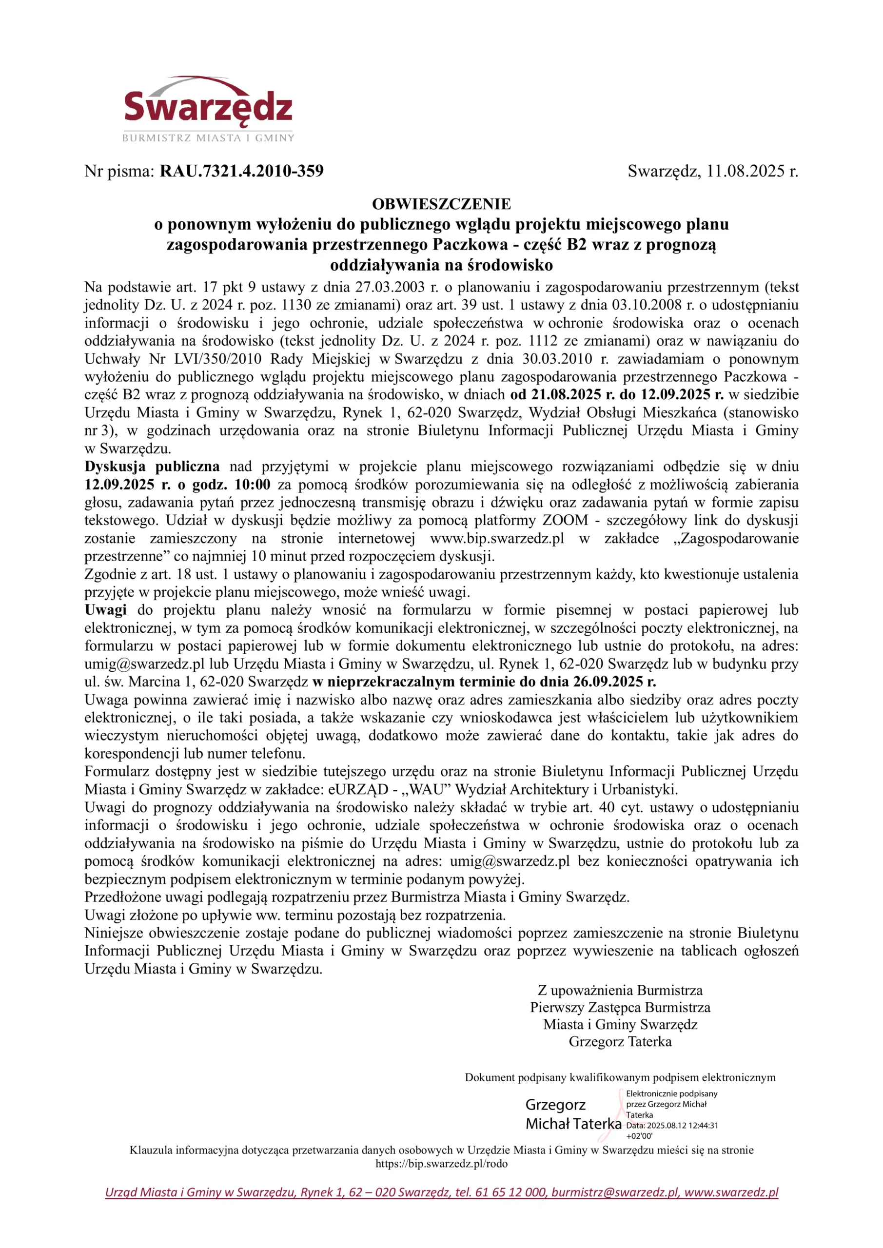 Uwagi do projektu planu należy wnosić na formularzu w formie pisemnej w postaci papierowej lub elektronicznej, w tym za pomocą środków komunikacji elektronicznej, w szczególności poczty elektronicznej, na formularzu w postaci papierowej lub w formie dokumentu elektronicznego lub ustnie do protokołu, na adres: umig@swarzedz.pl lub Urzędu Miasta i Gminy w Swarzędzu, ul. Rynek 1, 62-020 Swarzędz lub w budynku przy ul. św. Marcina 1, 62-020 Swarzędz w nieprzekraczalnym terminie do dnia 26.09.2025 r.