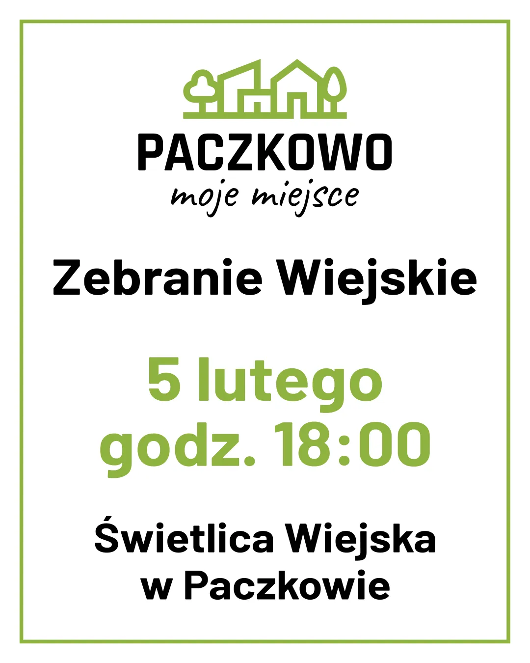 Serdecznie zapraszamy Paczkowian na Zebranie Wiejskie, które odbędzie się: 5 lutego 2026 r. (czwartek) o godz. 18:00 w Świetlicy Wiejska w Paczkowie