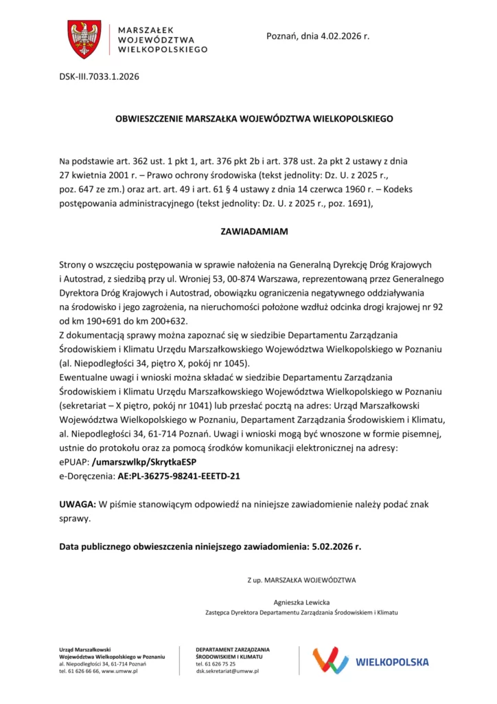 W sprawie pisma skierowanego w dniu 24.02.2025 roku do Marszałka Województwa Wielkopolskiego Pana Marka Woźniaka zostało wydanie obwieszczenie w sprawie nałożenia na GDDKiA obowiązku ograniczenia negatywnego oddziaływania na środowisko…