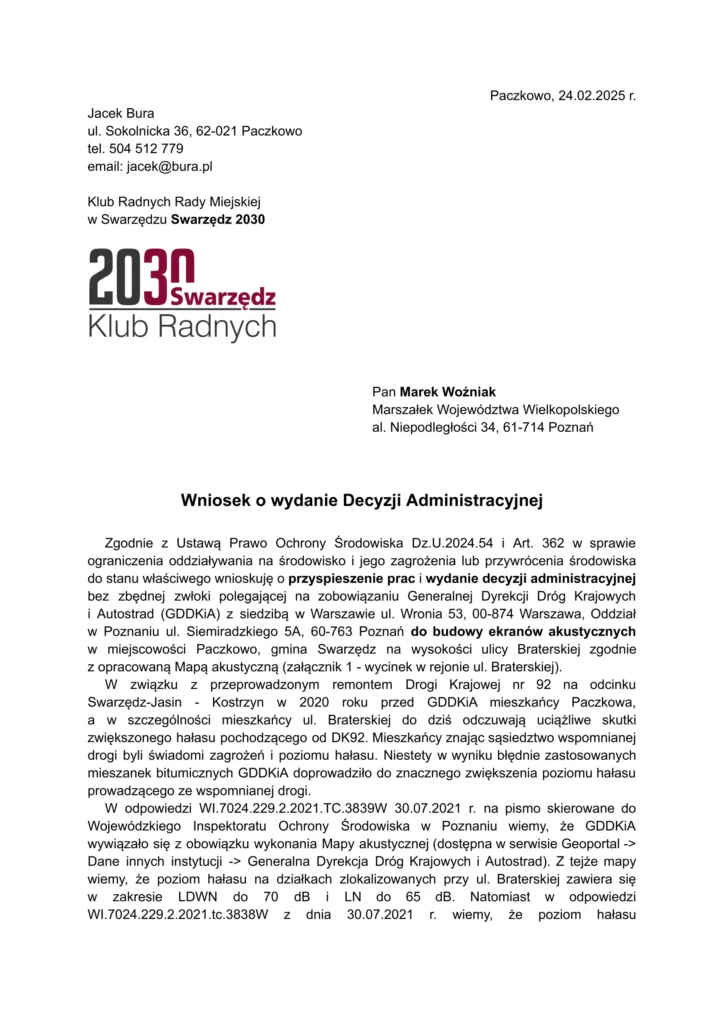 Wniosek – Ekrany akustyczne DK92 – Braterska
